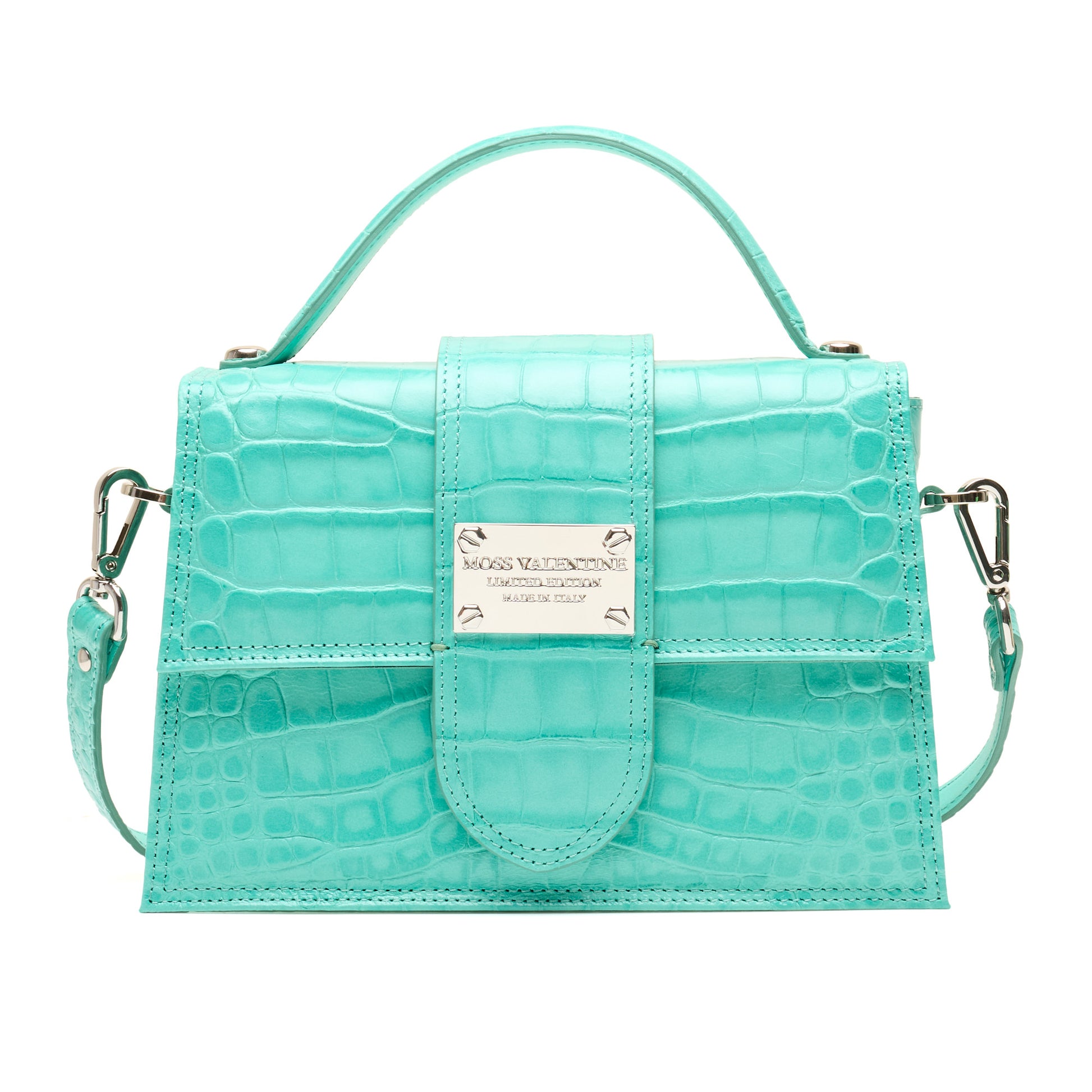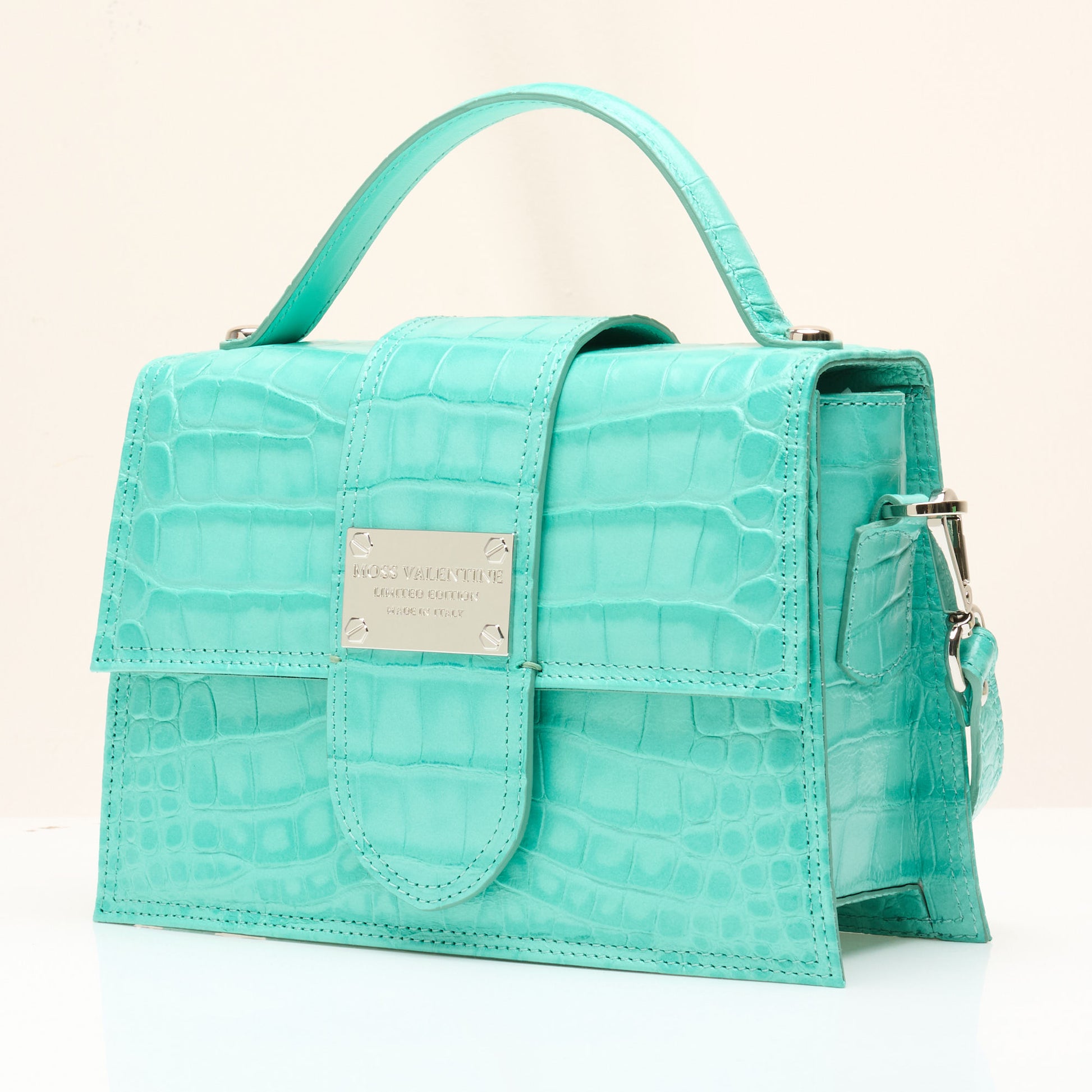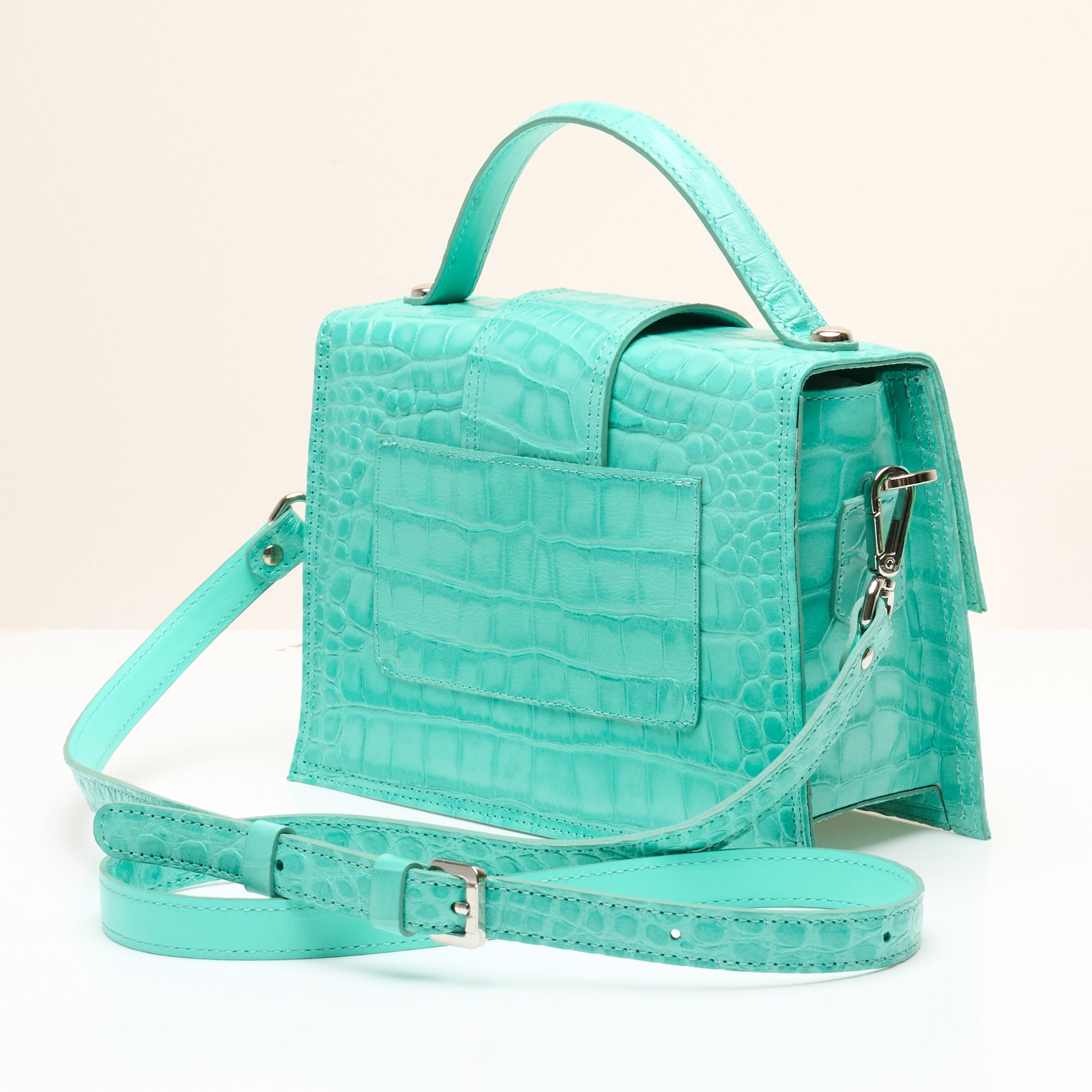 This turquoise crocodile-embossed bag brings a splash of summer luxury to your wardrobe. With its sharp structure, sculptural handle and high-gloss finish, it’s made to be noticed.